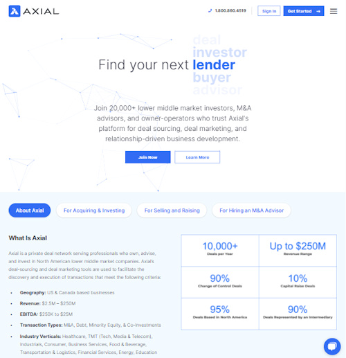 Axial is a private deal network serving professionals who own, advise, or invest in small and medium-sized businesses in North America. Members use Axial’s tools to source and promote deals, making it easier to discover and carry out transactions within certain criteria. Axial’s main goal is to simplify the deal-making process by connecting the right people with the right opportunities.