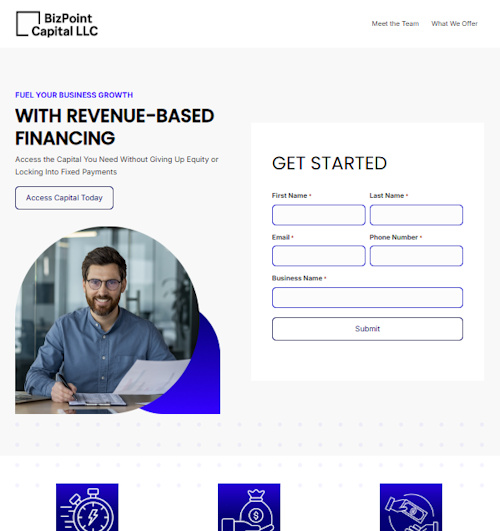 At BizPoint Capital, we specialize in revenue-based financing designed to help businesses grow and unlock capital without giving up equity or taking on traditional debt. Our mission is to provide smart, scalable funding that aligns with your revenue stream, giving you the freedom to grow on your terms.