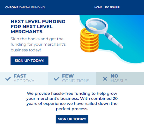 Chrome Capital Funding is purely ISO driven. Thank you to our hundreds of ISOs for your support and trust!