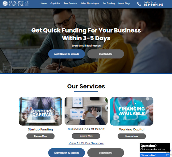 Fundmore Capital provides quick and easy funding for startups and small businesses. If you are looking to take your company to the next level, Fundmore Capital can help with several financing options. We work with multiple lenders who offer the best terms possible, so we can find a great option that works for you. Fundmore Capital has a solution for any loan size, whether it is for working capital or investing in equipment.