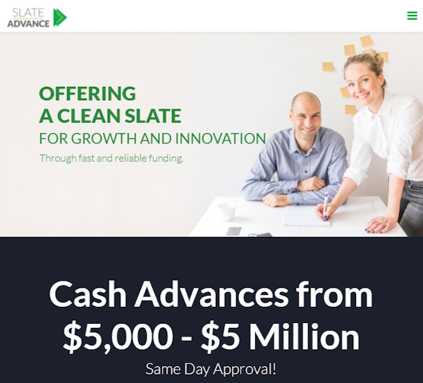 Slate Advance focuses on helping business owners run their operation more smoothly by providing the cash flow needed to take your business to another level. We are fascinated with helping our clients grow and provide fast cash advances with the lowest rates available.