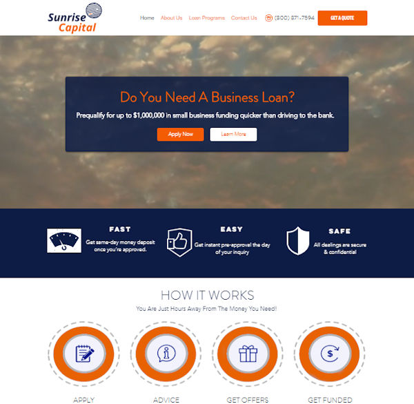 Sunrise Capital is a financial services provider focused on helping solve the cash flow needs of our small business customers. The founders of S.B.C are financial services professionals who have significant experience in developing successful businesses which is why We launched in April 2012 after experiencing firsthand how difficult it is for small businesses to get the working capital they need to grow.
