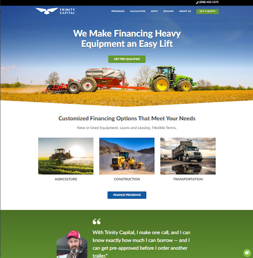 Since 2019, Trinity Capital has been partnering with clients on their agriculture, transportation and heavy equipment financing needs. We offer loan and lease options for new or pre-owned equipment. Our knowledgeable team is dedicated to offering you flexible terms, customized payment options, and expedient service with a personal touch.