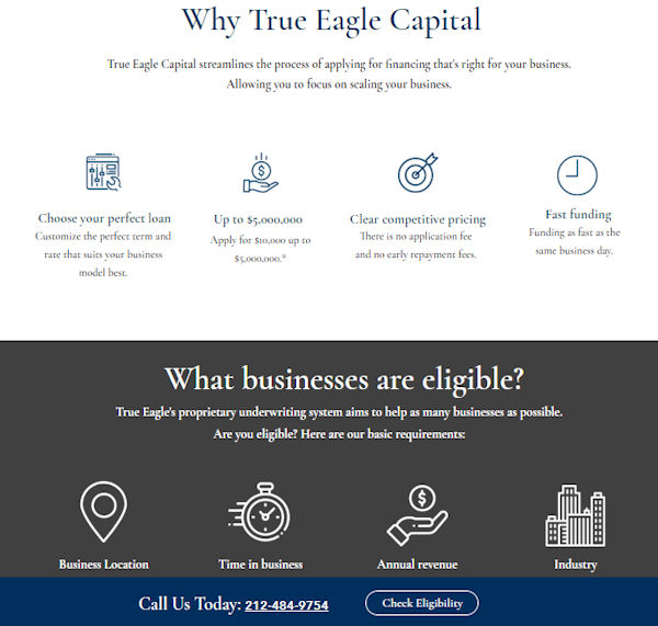 True Eagle Capital offers the most cost-effective business financing solutions geared towards growing your business. We pride ourselves on being the easiest to work with by minimizing the burden our clients face while searching for the right fit.